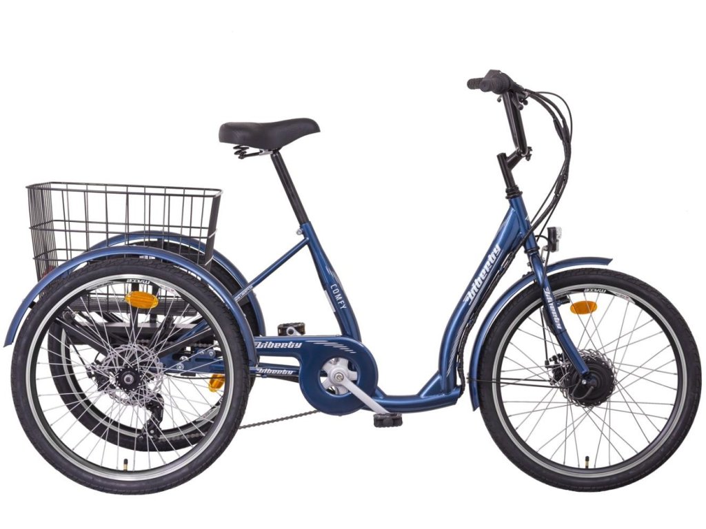 Nejnovější model elektro trojkolky Liberty COMFY s vylepšenou zadní nápravou, vybavený zadním 6 stupňovým měničem a diskovými brzdami na všech třech kolech. Tento model je vhodný především pro jezdce, kteří potřebují před nasednutím upravit polohu pedálů (klikami se dá volně otáčet směrem vzad) a jsou zvykli brzdit přední i zadní brzdou ovládanými pákami na řídítkách. Stejně jako nabízený 3 rychlostní model poskytuje trojkolka Liberty Comfy pohodlí při nastupovaní s nástupní hranou ve výšce pouze 250mm a bez problémů projde 80cm dveřmi díky zadní nápravě se šířkou 760mm. Trojkolka Liberty comfy disponuje širokými možnostmi nastavení posedu a díky prodloužené zadní časti rámu poskytuje dostatek místa na nohy i pro vyšší jezdce. Ve výbavě najdete parkovací brzdu, prostorný zadní koš s rozměry 500x350x350mm na umístění Vašeho nákladu a bateriové LED osvětlení.