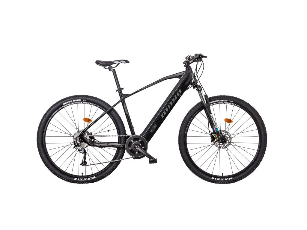 ELEKTROKOLO MAYO e-XC 29 Flasch ve velikosti 29", dojezd 35 -120 km, baterie Li-ion 36V/14Ah (500Wh) integrovaná v rámu, středový motor 36V /250W, odlehčený rám (slitina hliníku AL6061), velikost 19", přední odpružená vidlice SUNTOUR zdvih 100mm, sportovní osazení SHIMANO kompatibilní, páčkové řazení , 10 převodů, SHIMANO HYDRAULIC DISC brzdy, dvojité ráfky, pláště CST