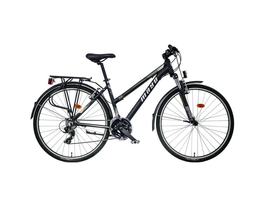 Trekkingové jízdní kolo 28" MAYO XR BASIC LITE TREK FLAT, odlehčený rám (slitina hliníku Al 6061) integrovaná lanka uvnitř rámu, přední odpružená vidlice zdvih 75mm , dvojpáčkové řazení, 21 převodů, dvojité ráfky, brzdy V-brake, pláště CTS, v nabídce také jako Cross model. Kompletní výbava pro provoz na pozemních komunikacích sada blatníků se vzpěrami, bateriové LED osvětlení, středový stojan, nosič kola .Rám: Aluminium AL6061, TIG welding, Down tube bended Bi-Axial shape, S-Type seat stays, Integrated Ahead headparts
