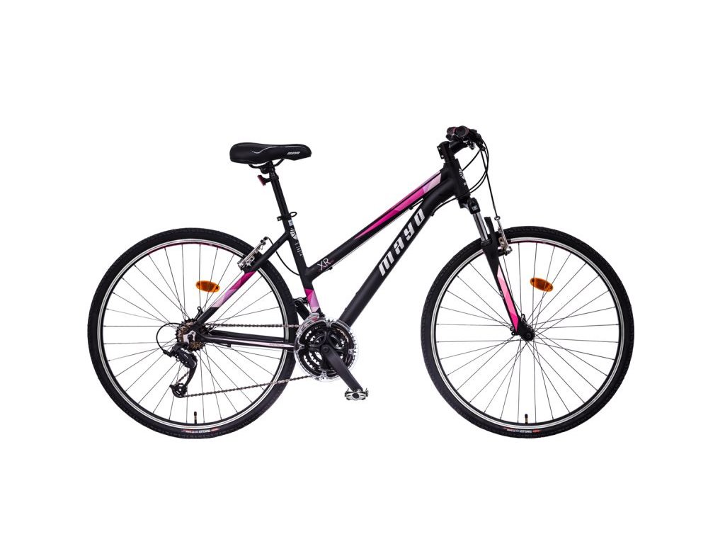 Dámské cross jízdní kolo 28" MAYO XR BASIC LITE FLAT , odlehčený rám (slitina hliníku Al 6061) s tvarovanou spodní trubkou, vnitřní vedení káblů, velikost rámu 18", přední odpružená vidlice SUNTOUR M3010AL páčkové řazení, 21 převodů, dvojité ráfky, brzdy V-brake, pláště CTS, v nabídce také jako trekking model.Rám: Aluminium AL6061, TIG welding, Semi-Integrated Ahead headparts