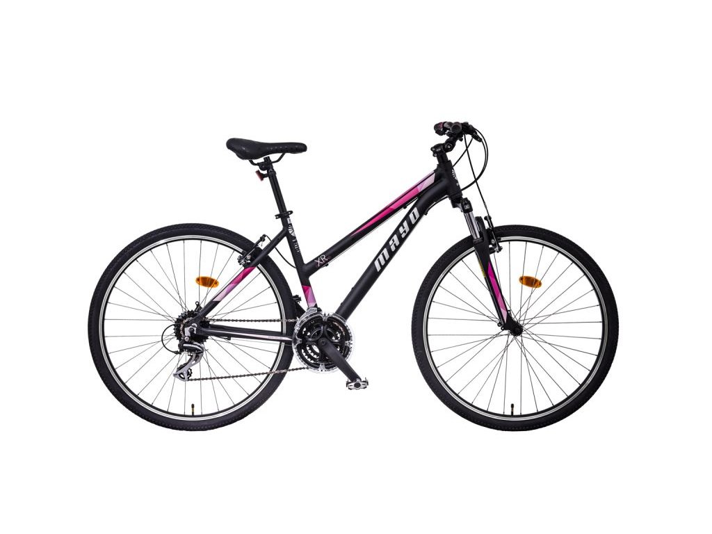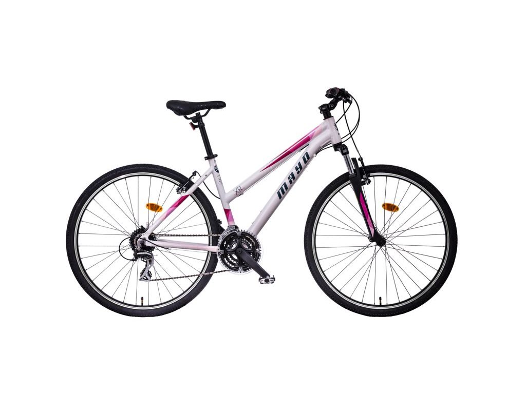 Dámské crossové jízdní kolo 28" MAYO XR TOUR V, odlehčený rám (slitina hliníku AL6061) s tvarovanou spodní trubkou, přední odpružená vidlice SUNTOUR M3010 s nastavitelným předpětím a zdvihem 75mm. Osazení SHIMANO ACERA. 27 převodů, dvojité ráfky, stavitelný představec, alloy kliky LASER, pláště CST, značkové díly M.A.T.E., v nabídce také jako kompletně vybavený model trekking.Rám: Aluminium AL6061, TIG welding, Integrated head parts, Internal cable routing